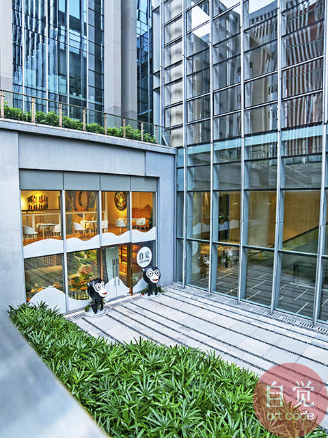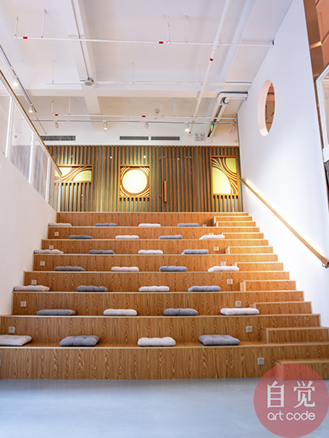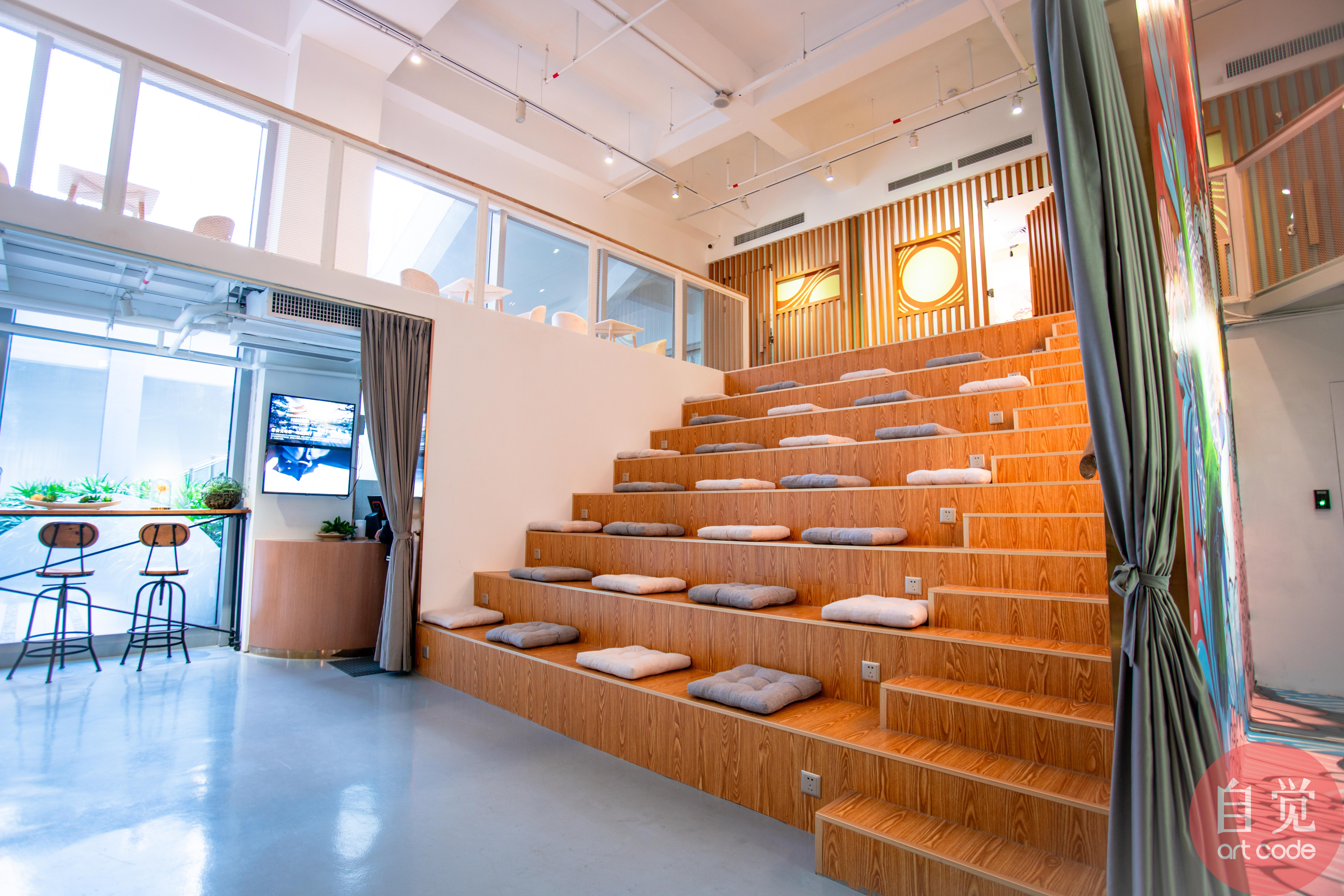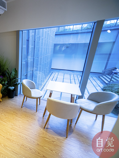 自觉艺术将这个位于广州琶洲会馆店铺改装成一个吸引新一代数字游民、艺术新锐派、充满活力的精品艺术品味空间。在无损原有独特结构的前提下,用“钢”、“木”、“石”打造现代简约的风格,用“舞台”、“空间站”、“花园”的元素打破先前空旷单调的空间,使其成为一个空间尺度亲切,舒适宜人,鼓励多种用途的地方。《当艺术馆遇上舞台》,《城市中会呼吸的空间站》,《自觉地中的花园》。